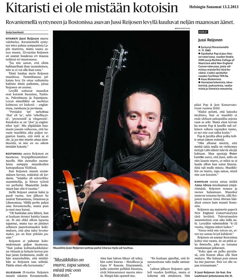 “Jussi Reijonen is an exceptional musician. On his debut recording as a leader, Un (Self Produced, 2012), the Finnish guitarist/oudist has succeeded in crystallizing a spectrum of influences, sounds and textures into a highly personal, sensual mosaic that blurs the distinction between jazz, Middle Eastern traditional music, West African music, and even Finnish folk elements.“